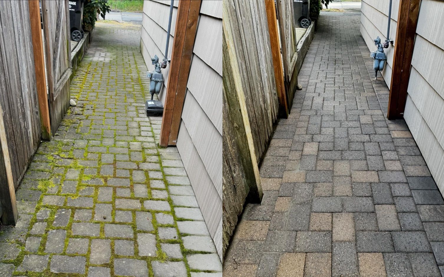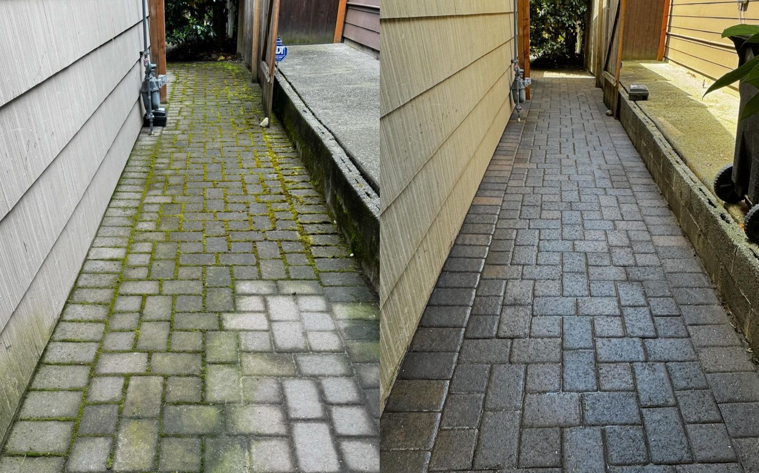 We love how these before and after photos illustrate what pressure washing can do to transform an outdoor surface. Pressure washing has the power, literally and figuratively speaking, to make a mossy interlocking paver walkway look freshly installed again, or make a grimy residential driveway shiny and moss-free like new. All of these photos were taken in the spring of 2024. Take your spring cleaning outside this year, and make your outdoor spaces sparkly clean!