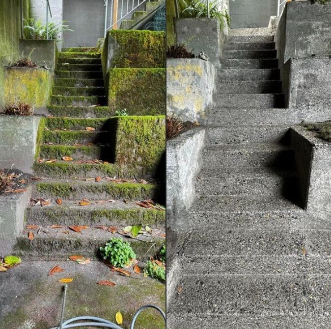 Cleaning steps and walkways of moss improves their appearance, but it is also far safer given how slippery wet moss is to walk on. Although cement is far more forgiving than other surfaces, correct technique and equipment is still important. I only use top of the line professional surface cleaning machines to ensure consistent cleaning across an entire area. My industrial grade machines and specialized wands and nozzles are capable of generating over 4,000 pounds per square inch of pressure exactly where needed to remove stubborn cement stains.